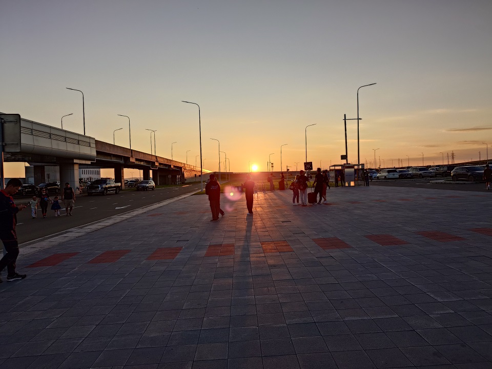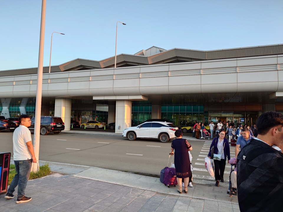 東京新国際空港(成田)発14:40、ウランバートル着19:15(現地時間、日本との時差は-1時間なので日本は20:15)。現在日本~モンゴルの定期的な直行便はモンゴル航空(MIAT)のこの1路線のみ(夏の観光シーズンのみ、関空からも出ているようである)。日本から見ると北回帰線に近い国なので、飛行機を降りて空港の外に出た20:00頃でまだこの明るさである。