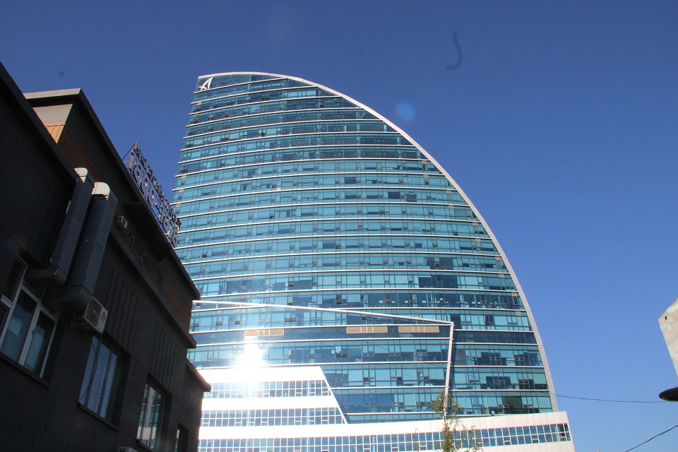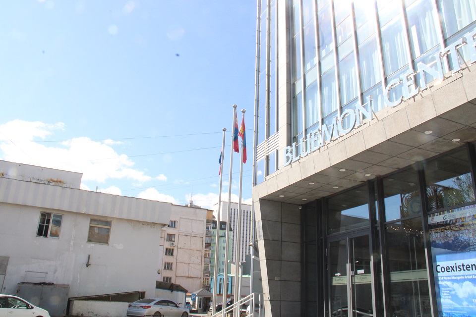 Монголд ирсэн хоёр дахь өдрөө өглөөний цайны өмнө зочид буудлаа тойрон зугааллаа. Спрингс зочид буудал нь Улаанбаатар хотын төвд байрладаг тул жуулчны гарын авлагад заасан бүх газрыг өглөө 30 минут алхах боломжтой. Зургийн зүүн талд байгаа хагас сар хэлбэртэй барилга нь The Blue Sky Hotel & Tower хэмээх 5 одтой зочид буудал бөгөөд манай бүлгийн оршин суудаг зочид буудал биш юм. Зургийн баруун талд байгаа нь төрийн ордон юм. (Монголын парламентын ордон) Монголд ирэх бүртээ харсан тэр газрыг жуулчдын газрын зурагт Сүхбаатарын талбай гэж бичдэг.